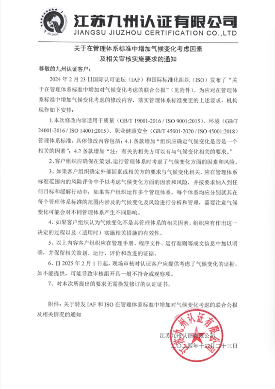 附件:關(guān)于轉(zhuǎn)發(fā)IAF和ISO在管理體系標(biāo)準(zhǔn)中增加對氣候變化考慮的聯(lián)合公報(bào)及相關(guān)情況的通知